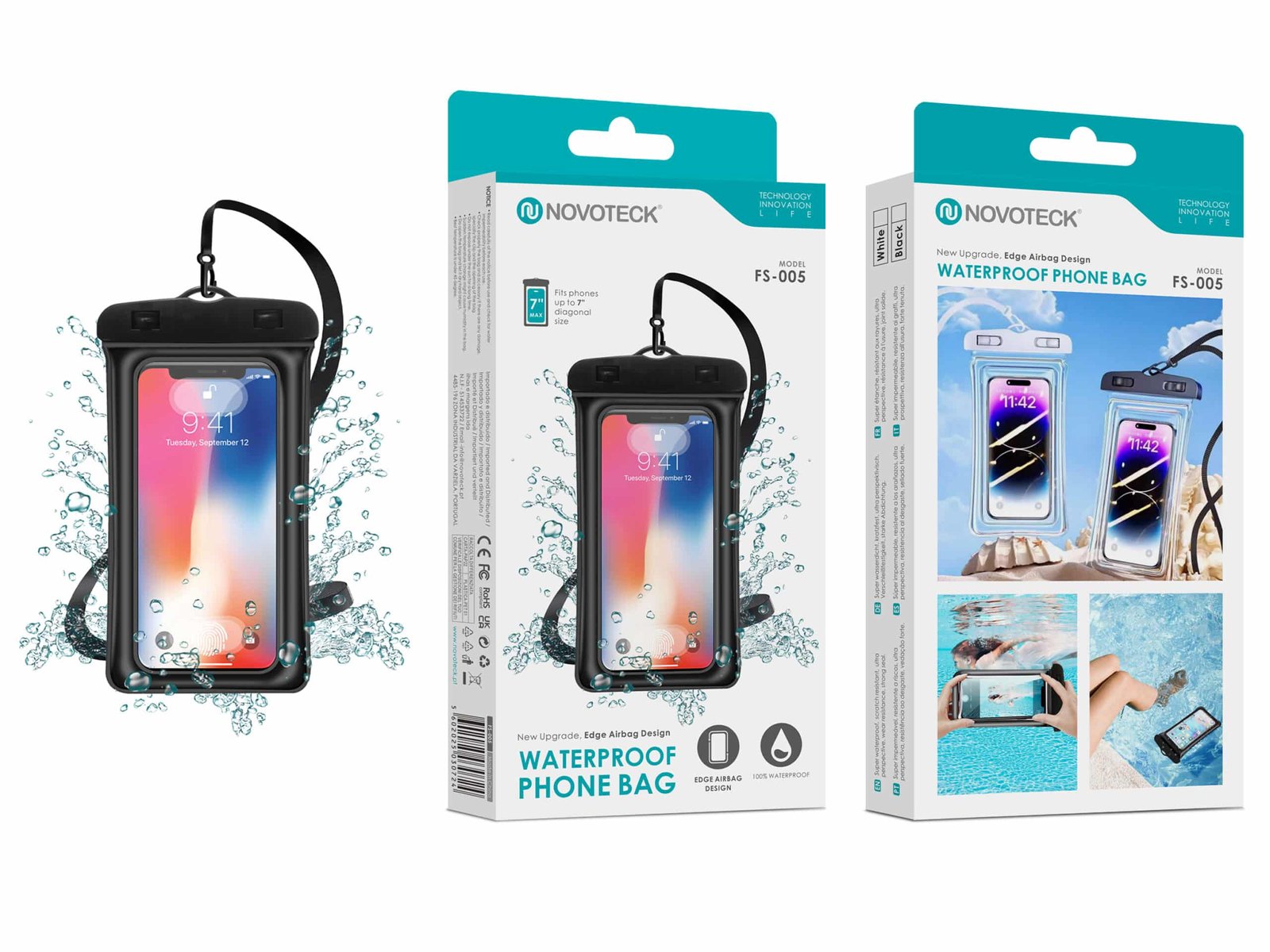 A NOVOTECK FS-005 é a versão aprimorada da clássica bolsa impermeável, agora com um inovador design airbag nas bordas que permite que o seu telemóvel flutue na água — perfeito para quem pratica desportos aquáticos ou quer garantir máxima segurança em ambientes molhados.
